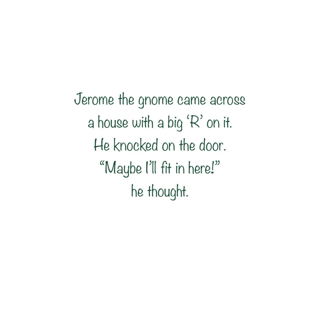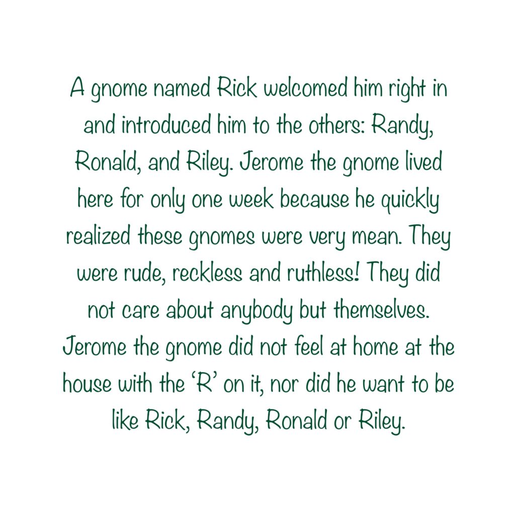 This christian children’s story begins with Jerome the gnome realizing its time to go out on his own and search for his forever home. He gets invited into many gnome’s homes, but quickly realizes that there is sin happening within the walls of each home! One is filled with rude, reckless and ruthless gnomes. Another is filled with gnomes that worship Zeus – a fake god! The next is filled with a bunch of liars! And the one after that, no gnome let Jerome inside, because they were too fearful…