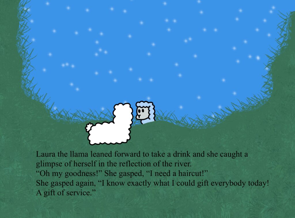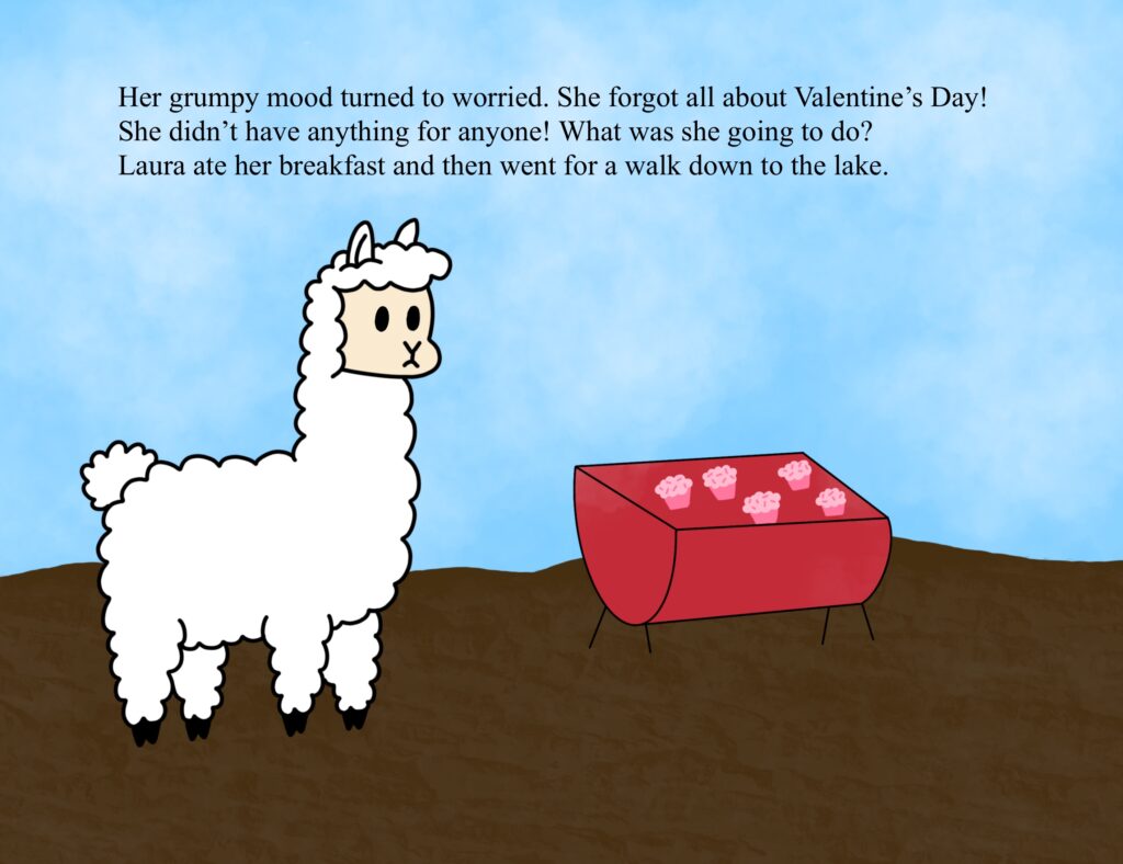 Laura the llama starts her day extremely grumpy and it only gets worse when she realizes she FORGOT that it’s Valentine’s Day! So she retreated to the pond by herself to reflect and relax, and the idea came to her like a blessing from above. She ran to the barn and got ready. And then she offered everyone on the farm free hairstyles!