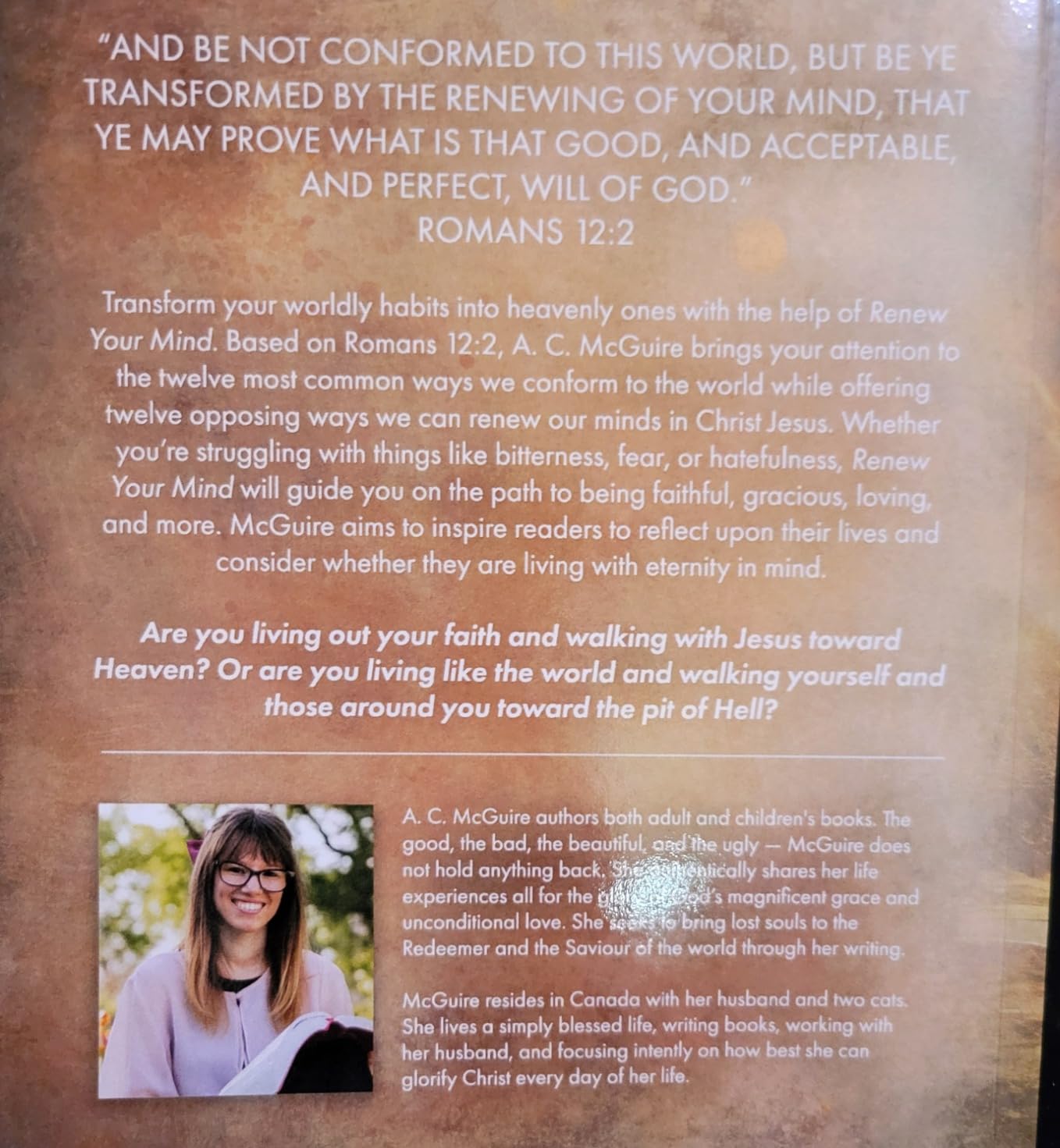 This book reminded me that how we live our day to day (even minute to minute) lives really matters, and that Christ really does hold us to a higher standard that we are called to meet so that we may honour and glorify Him. Praise the Lord for putting this book on A. C. McGuire’s heart. She did a tremendous job at glorifying our Father in Heaven. May we all walk closer to Him every day of our lives.
